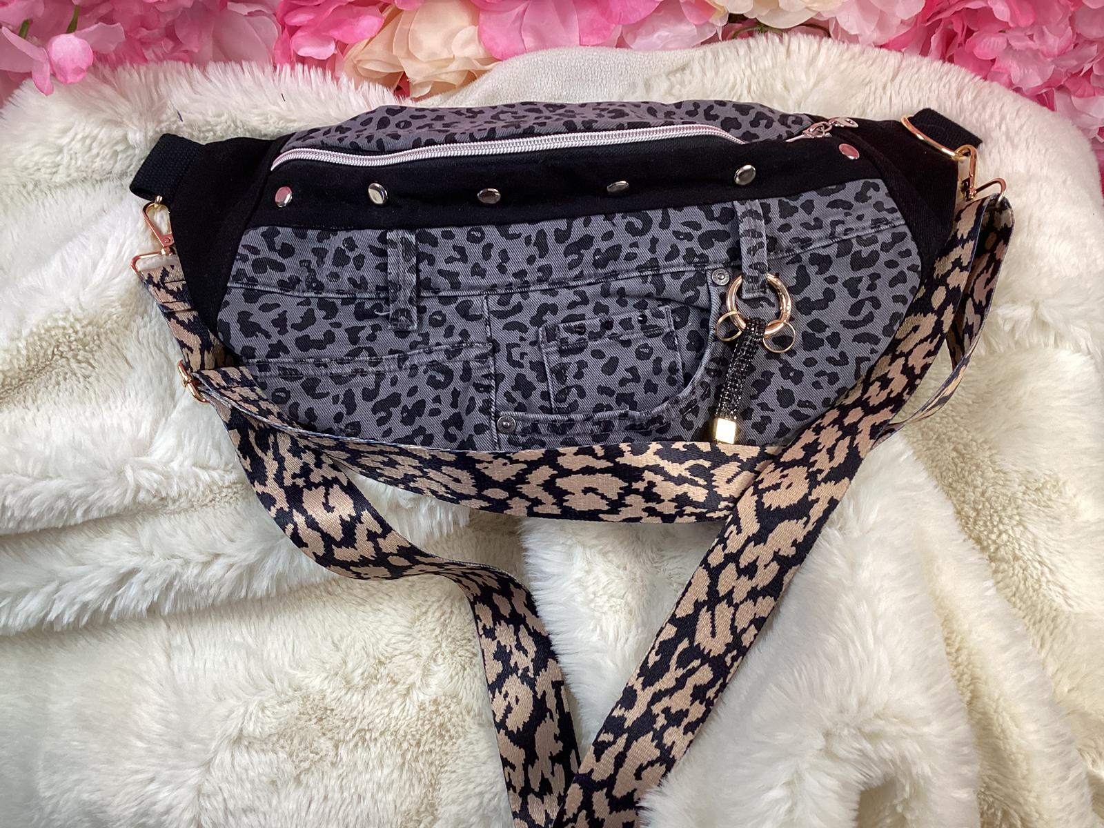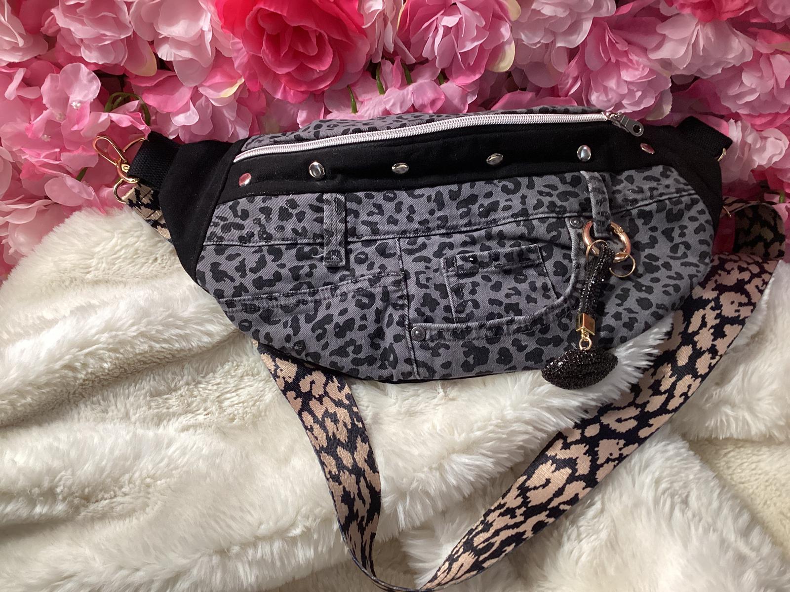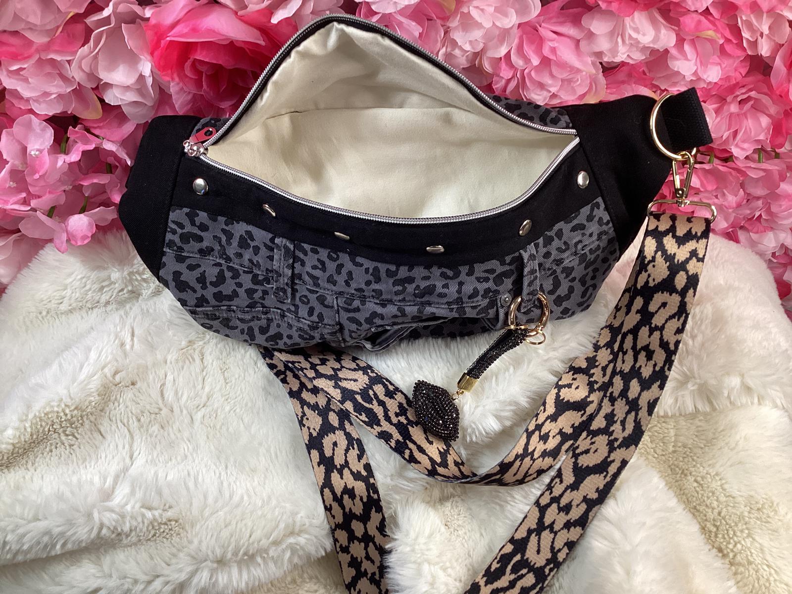 the perfect accessory for the modern, on-the-go woman. The bold animal print denim