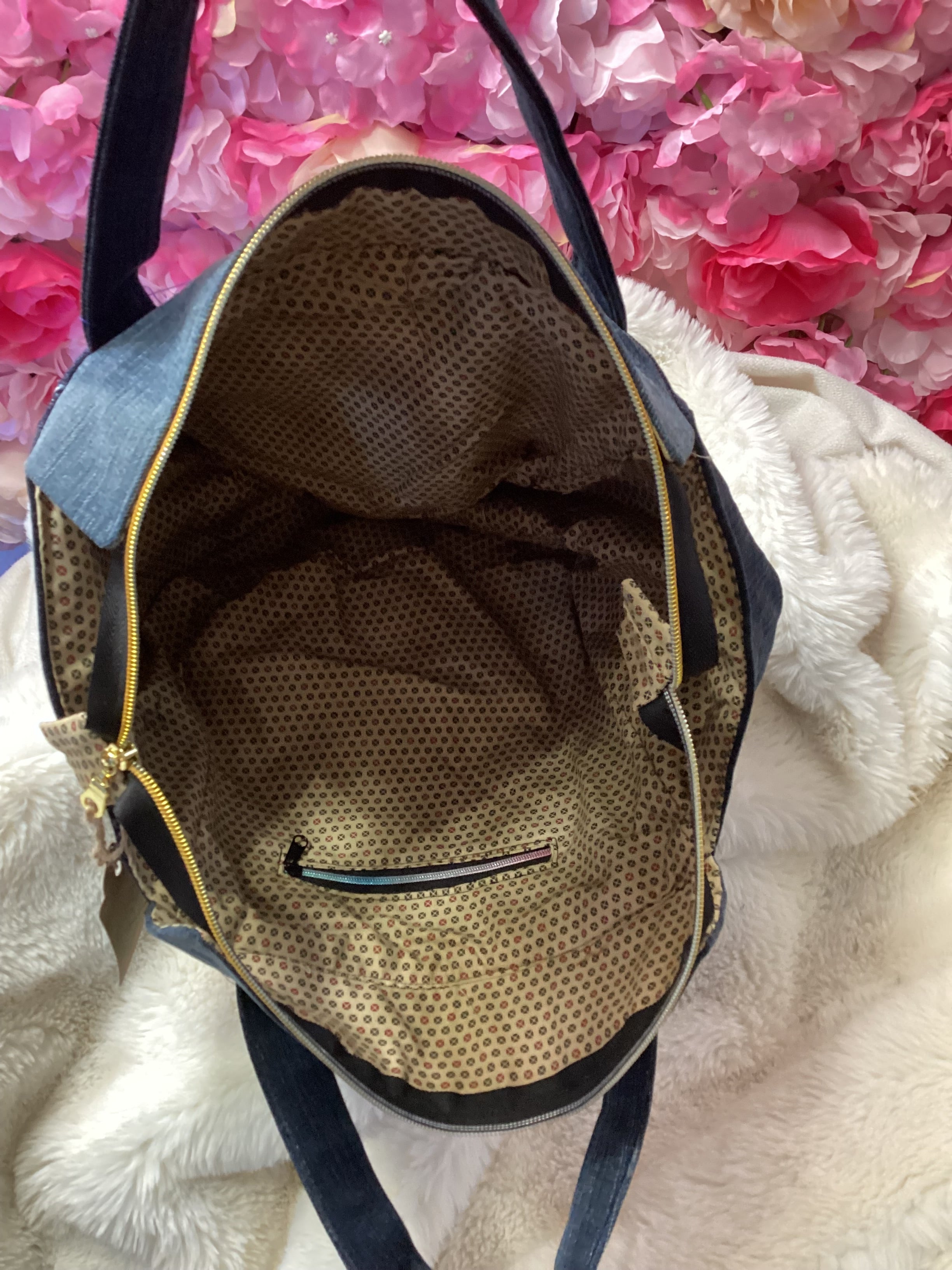 The roomy zip-top closure keeps your essentials secure, while the fully lined interior features a zippered pocket for easy organization of smaller items. Long denim handles make it comfortable to carry by hand or over the shoulder, giving you versatility for busy days on the move.