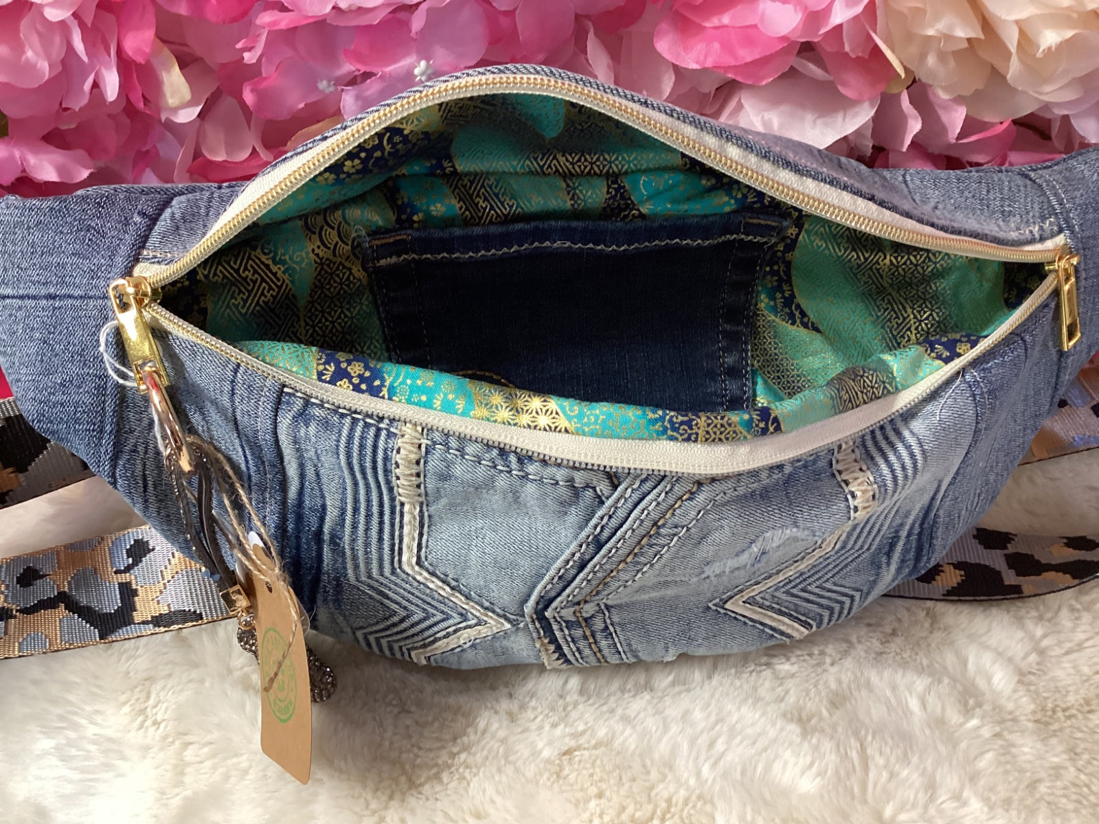 from reclaimed denim. Featuring a bold embroidered design, this bag blends style and