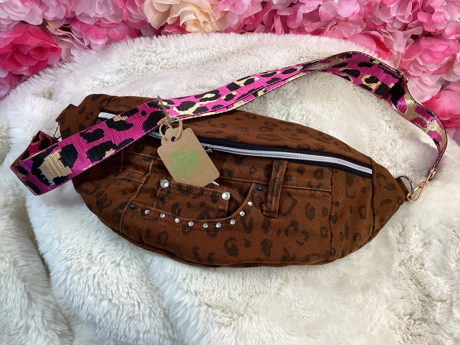 Turn heads with this eye-catching Sling Bag made from reclaimed animal print denim.