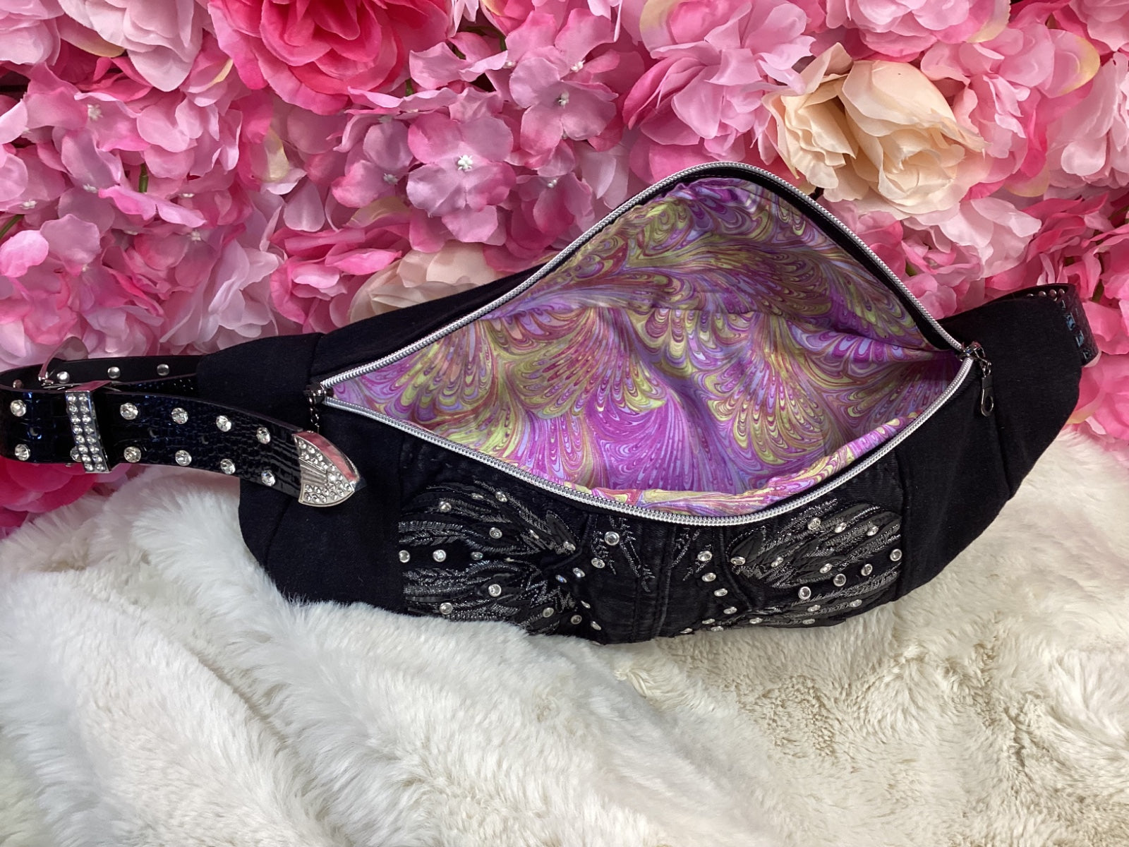 ● Reclaimed black denim with embroidery and rhinestones