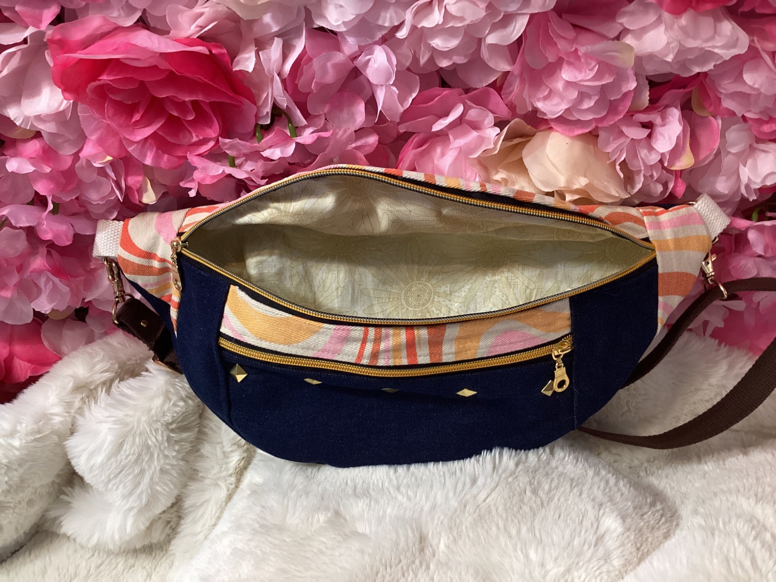 • Dark white denim with retro-inspired accents in orange, pink, cream, and brown