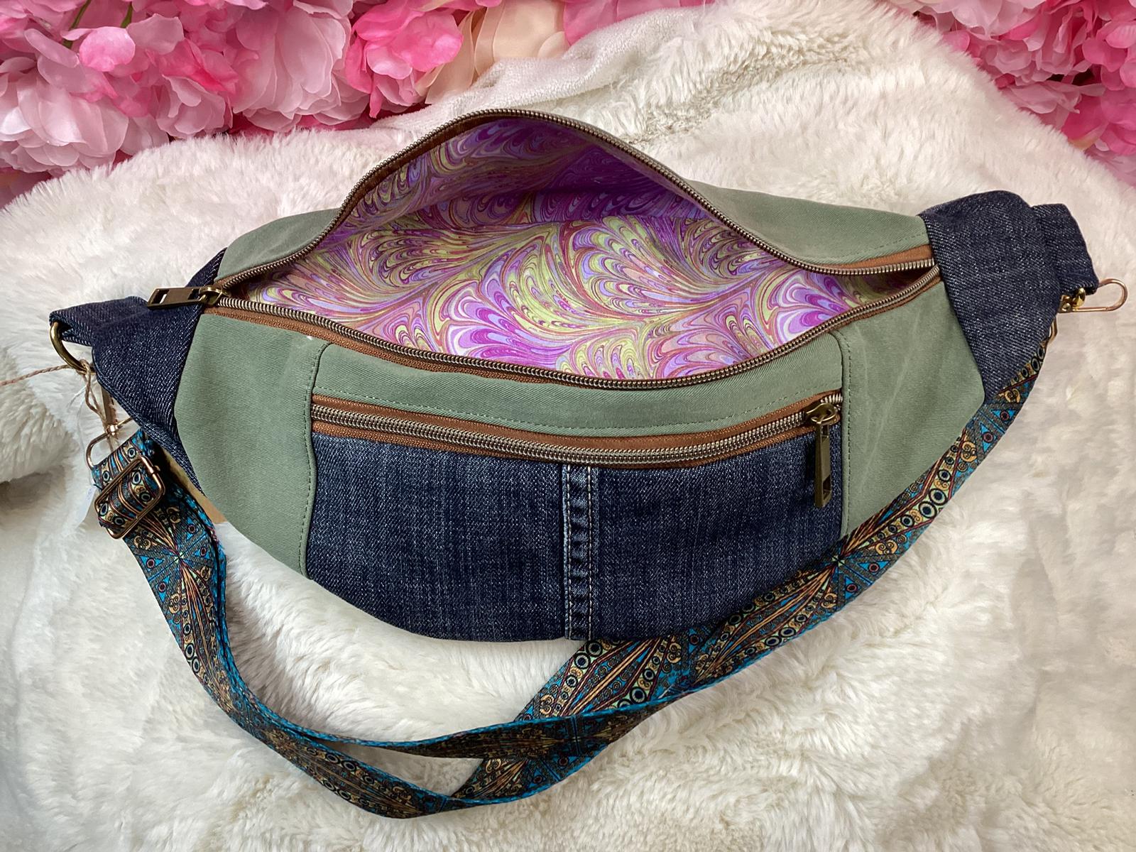 while elevating your look. The unique blend of denim fabrics and colorful strap details